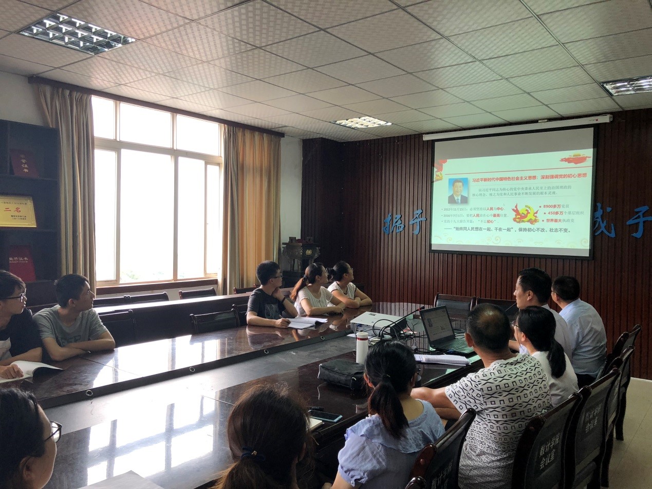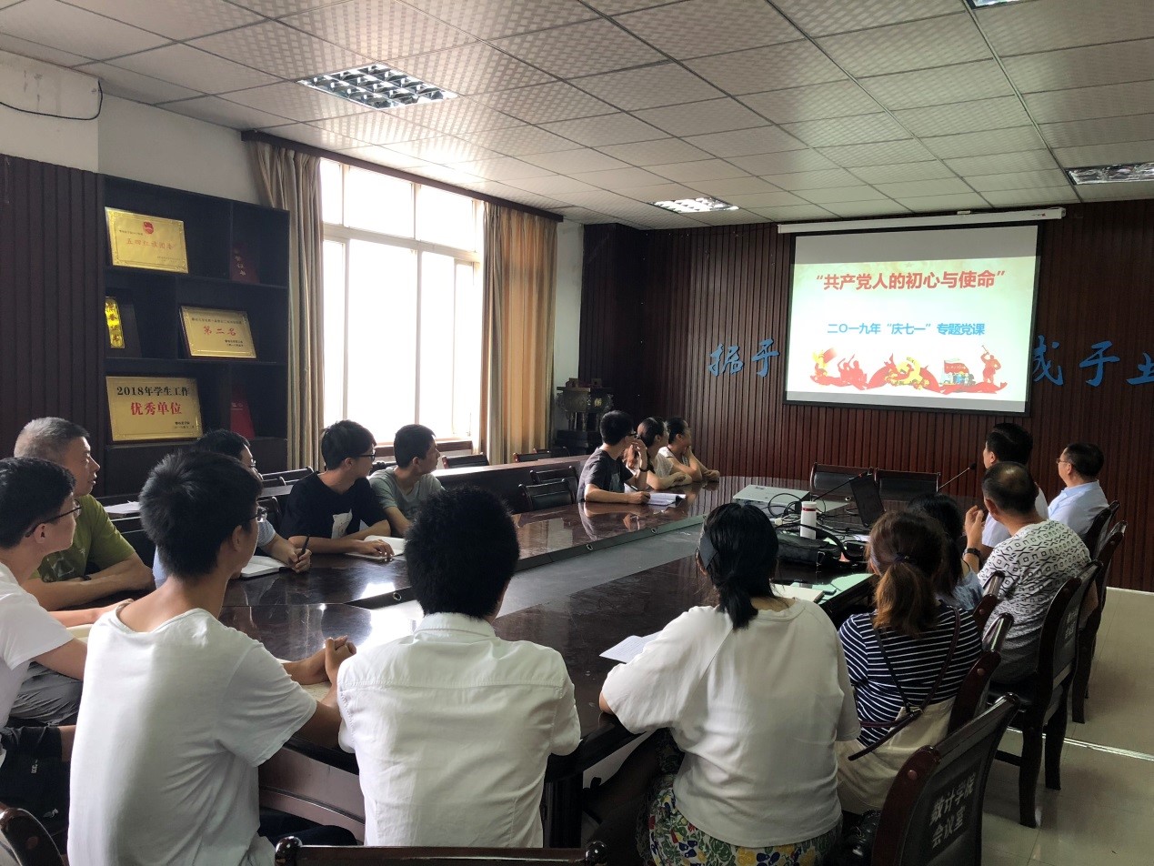 为进一步引导广大党员、领导干部“不忘初心、牢记使命”,为深入学习贯彻党的十九大精神和习近平新时代中国特色社会主义思想,增强党支部的凝聚力和战斗力,发挥党员的先锋模范作用,2019年7月4日下午15:10-16:40,数学与计算机学院教工一支部在数计学院会议室开展了“共产党人的初心与使命”2019年“庆七一”专题党课,党课由教工支部支委朱正国老师主讲。通过党课,全体党员理解了“中国共产党人的初心和使命”,就是为中国人民谋幸福,为中华民族谋复兴。