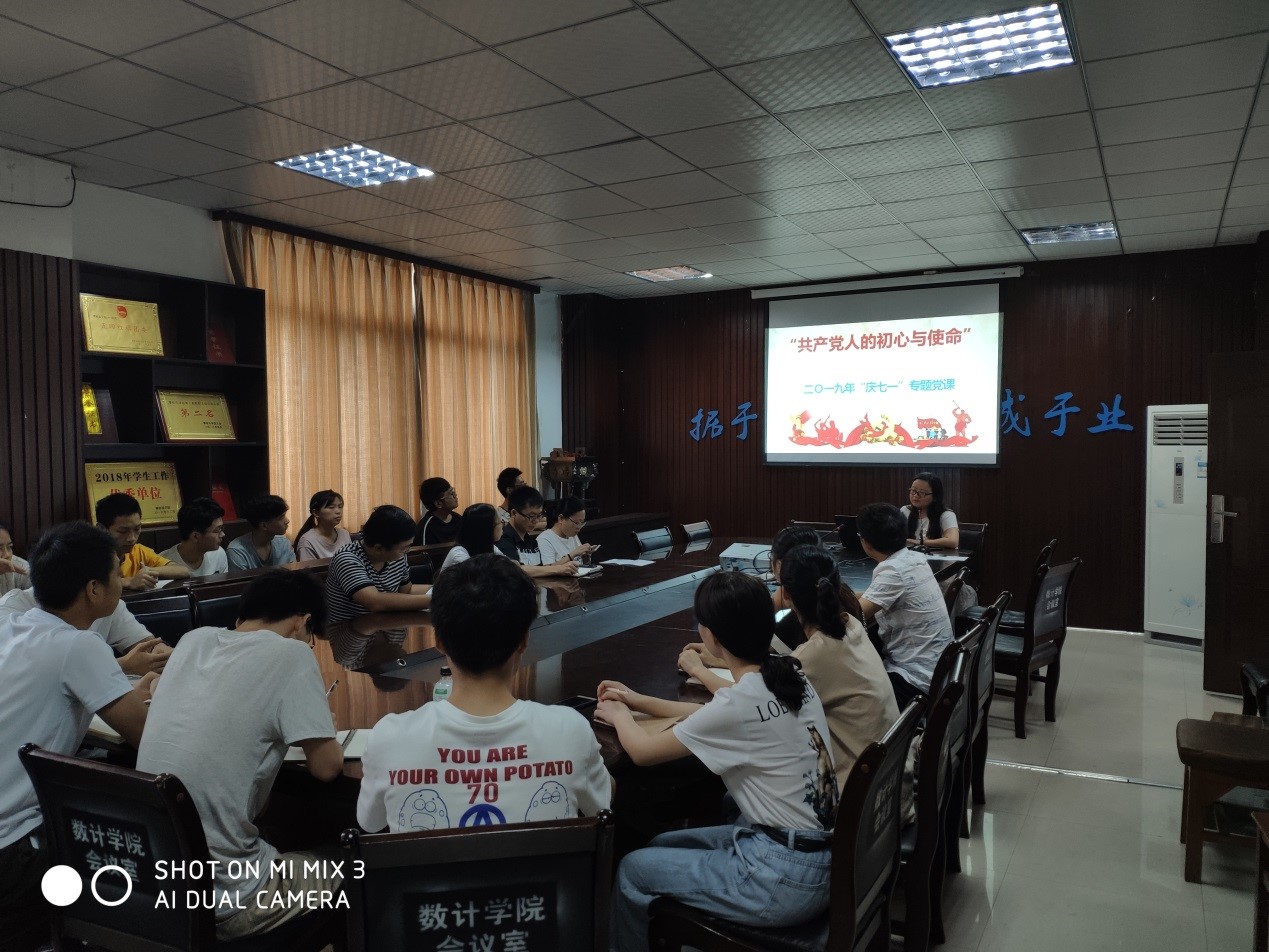 2019年7月4日上午9点,数学与计算机学院学生第一、第二党支部在攀枝花学院励志楼四楼会议室403进行主题为“共产党的初心与使命”二〇一九“庆七一”的主题党课,本次大会由数学与计算机学院学生第二党支部龚萍书记主讲,大会中党员同志认真听讲龚书记讲解,认真做笔记,并积极参与讨论。