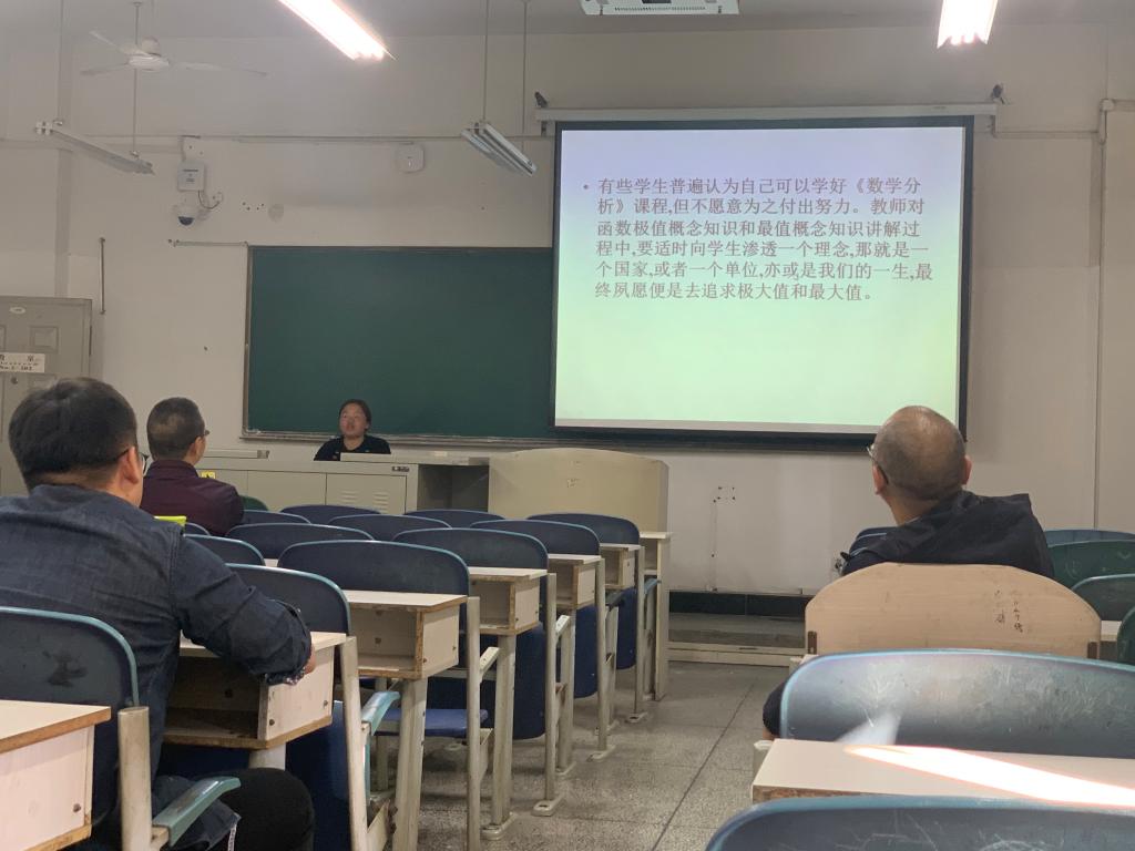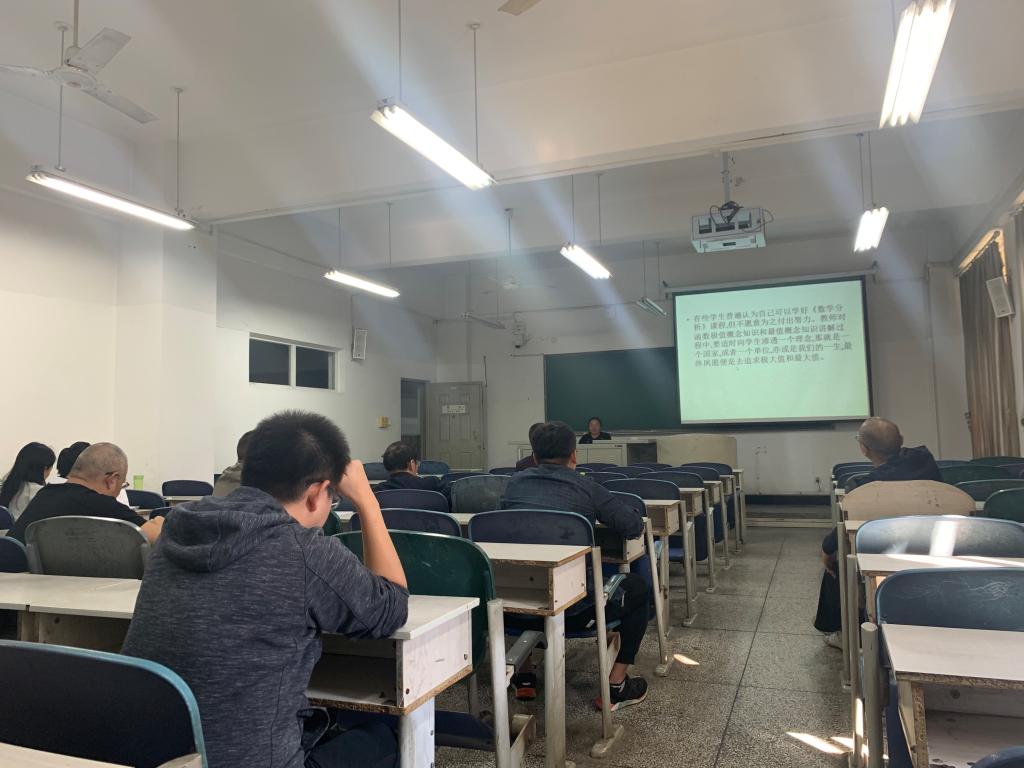 为进一步深化“不忘初心、牢记使命”主题教育活动精神,数计学院高度重视意识形态工作,于2019年11月20日下午3点在2教202开展了课程思政研讨活动,学院全体数学教师参加。数计学院高等数学教研室徐丽君老师声行并茂地给大家解读了思政内容融入到《数学分析》专业课程中的探讨。信本教研室于勇老师深入分析了“新时代如何打造金课”。