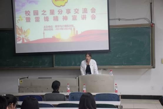 本报讯(黄铮报导)3月14日19:50,数学与计算机学院在本部二教2-2进行了校园之星交流分享会。此次活动由自强之星李林聪、实践之星提名奖丁川芸和学习之星提名奖王光琴分别对雷锋精神的意义、诚信、感恩做出相关见解以及宣传。