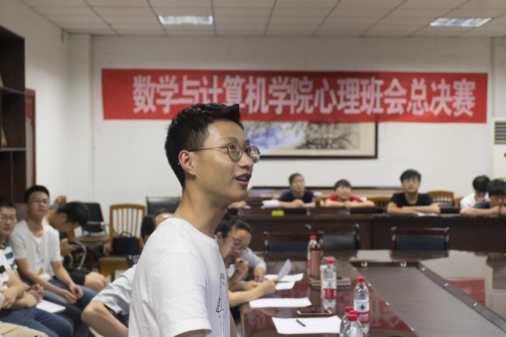 本报讯(谭鑫报导)4月28日晚上19:30,数学与计算机学院在砺志楼四楼会议室开展心理班会院内总决赛。18级各班心理委员参与决赛,讲述着自己班的心理班会流程。数计学院党委书记张清学、党委副书记林宗兵、18级辅导员龚萍和田静现场评价各班班会并按要求打分。