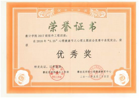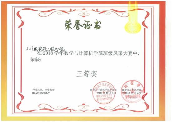 工作方面,他在2017-2018学年担任数学与计算机学院同心社干事并获得“优秀干事”荣誉称号;2017年至今担任2017级软件工程四班团支书并获得校级“优秀团干部”荣誉称号。作为班委的他,“身在其位,履其职,担其任”,努力为班级争取荣誉,他所属班级取得以下成就:校级“5.25心理健康节之心理主题班会”优秀奖、数学与计算机学院“纪念五四运动暨第二届班级合唱大赛”二等奖、数学与计算机学院班级风采大赛三等奖。