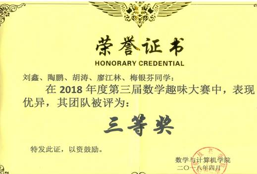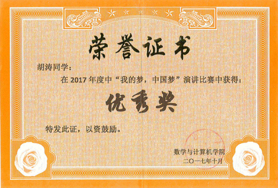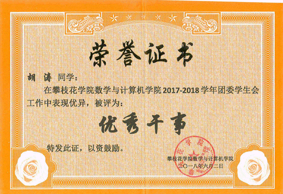 胡涛的主要事迹:2017-2018年担任数学与计算机学院同心社干事;2017年至今担任2017级软件工程四班团支书,负责班级团日活动、团员资料整理、团支部大会等活动的开展,按照要求完成工作。学习成绩名列前茅,综合素质排名专业前五,积极参与学校、学院组织的各个活动,并获得相应校级、院级等荣誉证书;任职期间获得社团优秀干事,所属班级获得校级“5.25心理健康节之心理主题班会”优秀奖、数学与计算机学院“纪念五四运动暨第二届班级合唱大赛”二等奖、数学与计算机学院班级风采大赛三等奖等荣誉。2018年4月完成入党积极分子培训,2018年9月加入志愿者迎新活动并参加数计学院开学典礼代表老生发言,2018年10月获得国家励志奖学金。