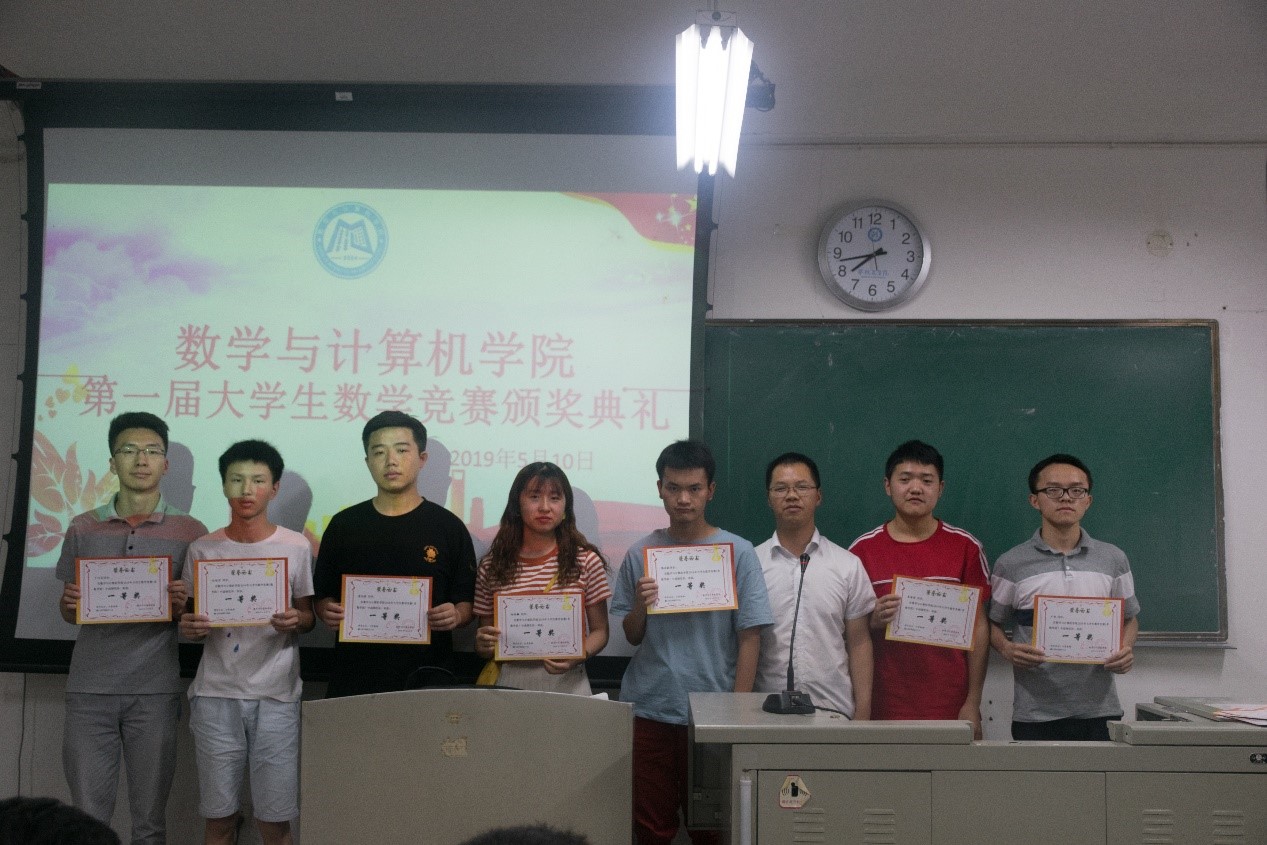 本报讯(任启祥报导)5月10日晚上7:30,数学与计算机学院第一届大学生数学竞赛颁奖典礼在二教2-211室正式开始,数计学院党委副书记林宗兵,学生科科长程江珂,分团委书记朱华,2018级辅导员龚萍担当本次大赛颁奖嘉宾。获奖的同学们积极参与本次颁奖。