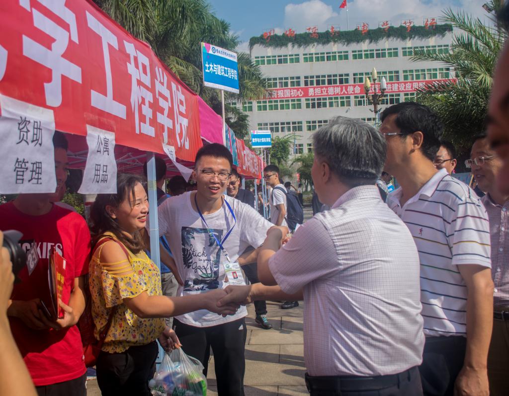 领导们对新生的到来表示高度重视,校长王曙光带队到各个服务点查看各学院新生报到的相关情况,询问医务处服务点新生身体情况,亲自向新生介绍数计学院的相关专业以及未来的发展方向,并在迎新现场与新生家长展开交流。与此同时我院迎新志愿者坚守岗位,井然有序的进行迎新工作并向有需要的新生及时提供帮助。在领导们的指导下我院迎新志愿者正逐步完成今日报到新生的记录与安置工作,显现出我院师生对新生到来的欢迎与热情。