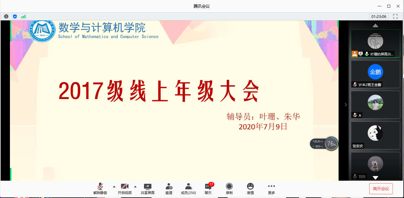 本报讯(刘鑫 报道)7月9日晚,数学与计算机学院在腾讯会议召开2017级学生年级大会。2017级辅导员朱华和叶珊出席本次会议,2017级全体学生参加,会议由朱华主持。