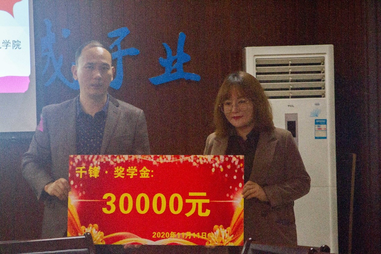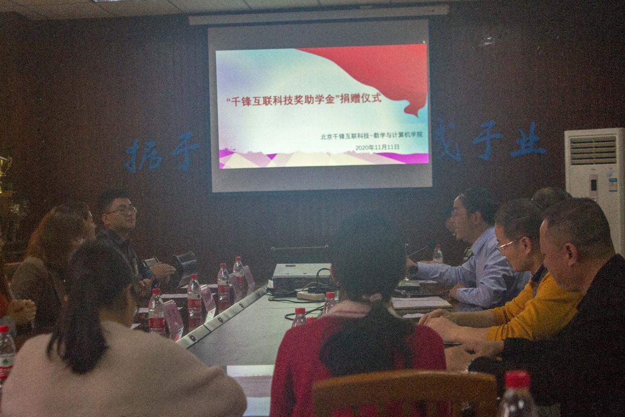 本报讯(蒋蕊宇 王俊楠报道)11月11日下午,数计学院在砺志楼四楼会议室举行“千锋互联科技奖助学金”捐赠仪式,参加此次会议的人员有数计学院院长张靖、党委书记张清学、党委副书记林宗兵、院长助理罗学刚、学生科分团委书记邓勇军、辅导员教师代表以及北京千锋互联科技代表王雪青、王海光、吴袁巧、罗艺等。党委书记张清学担任此次仪式的主持。