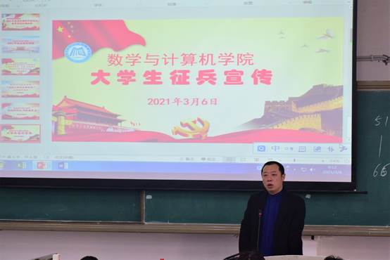 本报讯(蒋蕊宇 报道)为激发同学们的爱国热情,鼓励和动员大家踊跃报名参军,数计学院于3月6日上午在二教2-2举行大学生征兵宣传活动,参加此次活动的人员有数计学院党委书记张清学、党委副书记林宗兵、学生科科长兼分团委书记邓勇军、18级辅导员万丹、龚萍,19级辅导员田静,还有主席团成员,学生会社团干部,各年级班干部等。此次活动由邓勇军担任主讲人。