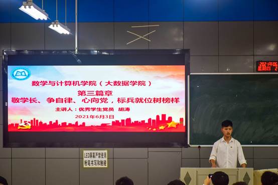 本报讯(王俊楠 报道),6月3日晚,数计学院在2教2-2教室开展了敬学长、争自律、心向党,标兵就位树榜样主题讲座。参加此次活动的人员有党委书记张清学、党委副书记姜承琳、18级辅导员龚萍、19级辅导员田静、关工委老同志梁志军老师、优秀教师党员刘冬兵、优秀学生党员胡涛、全体党员、预备党员、入党积极分子。胡涛担任本次讲座的主讲人。