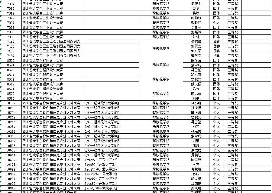 根据《四川省教育厅关于公布2017年省级大学生竞赛项目的通知》的文件结果,我院在2017年省级大学生竞赛项目中喜获佳绩。在获奖名单中,我校共有83名学生获得省级奖励,涉及11个竞赛项目。我院共有29名学生在四川省大学生数学建模竞赛、四川省大学生程序设计大赛、四川省大学生软件和信息专业人才大赛获得奖励,其中,省级一等奖4个,省级二等奖6个,省级三等奖19个,位于全校前列!