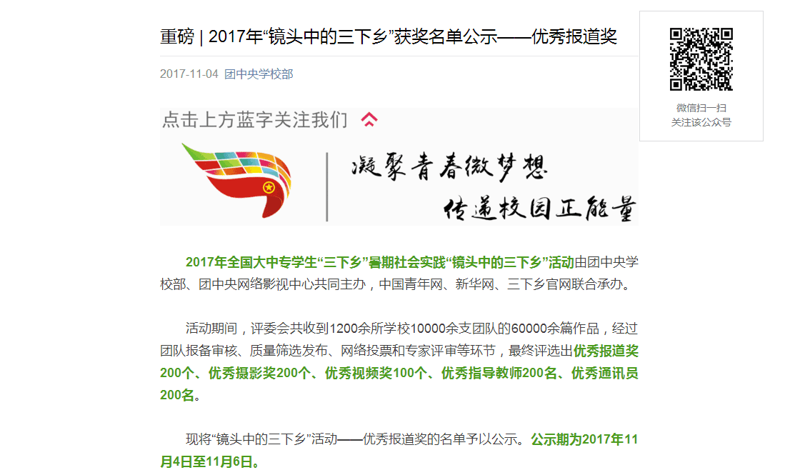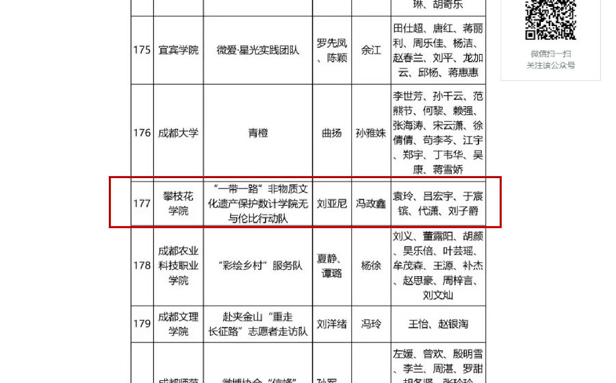 在由团中央学校部、团中央网络影视中心共同主办,中国青年网、新华网、三下乡官网联合承办的2017年全国大中专学生“三下乡”暑期社会实践“镜头中的三下乡”活动中,攀枝花学院数学与计算机学院暑期社会实践作品《攀枝花学院学子探访广西靖西织锦技艺 助力文化传承》是全校唯一一篇投稿成功的作品,并在活动中1200余所学校10000余支团队的60000余篇作品中脱颖而出,经过团队报备审核、质量筛选发布、网络投票和专家评审等环节后,数计学院“一带一路”非物质文化遗产保护数计学院无与伦比行动队”获得优秀报道奖,领队张丽老师获得优秀指导教师奖,于宸镔获得优秀通讯员奖。