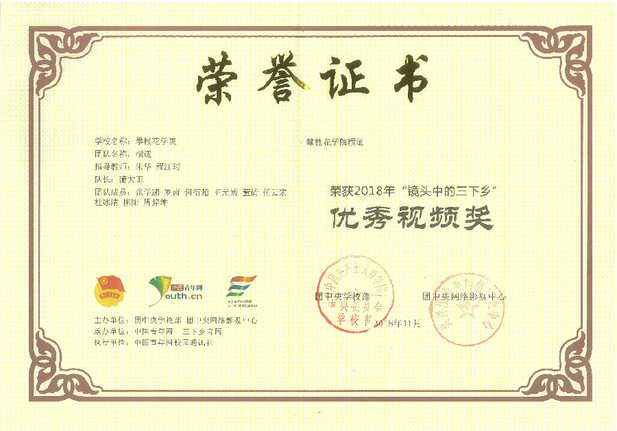 本报讯(周建国报导)2018年11月19日,由团中央学校部、团中央网络影视中心、中国青年网联合开展的2018年全国大中专学生“三下乡”暑期社会实践“镜头中的三下乡”活动获奖名单出炉,在数以万计的优秀作品与参加人员中,共评选出了200个优秀报道奖、200个优秀摄影奖、200个优秀视频奖、200名优秀指导教师、200名优秀通讯员。其中,数学与计算机学院程江珂与朱华老师带领的“槚道”团队制作的视频荣获“优秀视频奖”荣誉称号;数计学院分团委书记朱华荣获“优秀指导老师”荣誉称号;数计学院团委学生会主席蒲大卫荣获“优秀通讯员”荣誉称号。