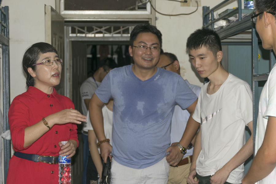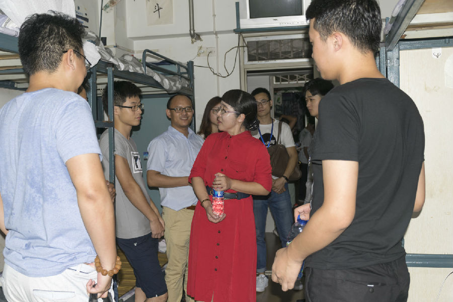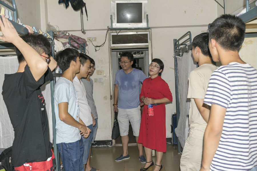 本报讯(袁慧 报导),为了了解新生们的到校情况,数学与计算机学院党委书记谭千蓉教授、学生科科长方青松老师,2017级辅导员程江珂、朱华于2017年9月5日晚抽查了数学与计算机学院的新生寝室。
