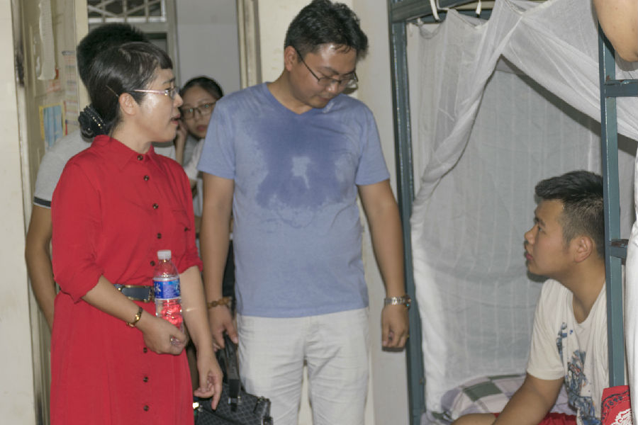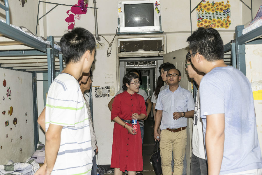 谭书记携方科长及两位辅导员来到新生寝室后,对寝室的卫生及安全情况进行了仔细的检查,和新生们进行了亲切的交谈,询问了他们对学院的意见与建议,并慰问了到校新生们的宿舍生活,并且殷切希望新生们能在接下来的学习和生活都能很好适应。