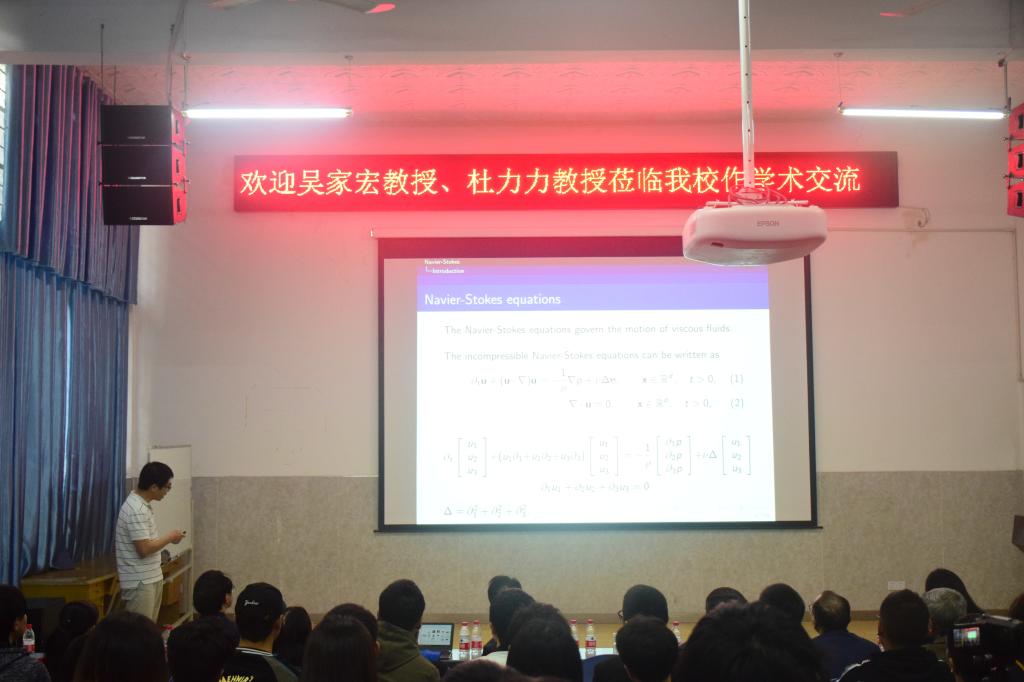 12月20日下午15:30,应邀来我校作学术交流的美国俄克拉荷马州立大学校董会杰出教授和AT&T冠名教授、博士生导师吴家宏老师和四川大学博士生导师杜力力教授,在我校外国语学院多功能报告厅分别作了题为“Stability problem from fluid dynamics”和“以一个实际问题谈偏微分方程在工程中的应用”的学术报告,数学与计算机学院党委书记张清学,党委副书记林宗兵,部分教师代表和学生代表近100人参加了此次报告会。