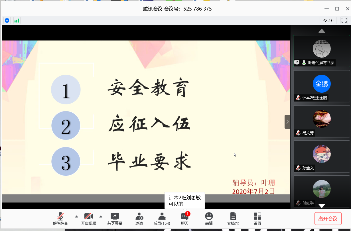 本报讯(王金鹏 报道)2020年7月2日19:00,2017级计算机科学与技术、网络工程全体同学在腾讯会议app召开线上年级大会,会议由2017级辅导员叶珊老师主持。
